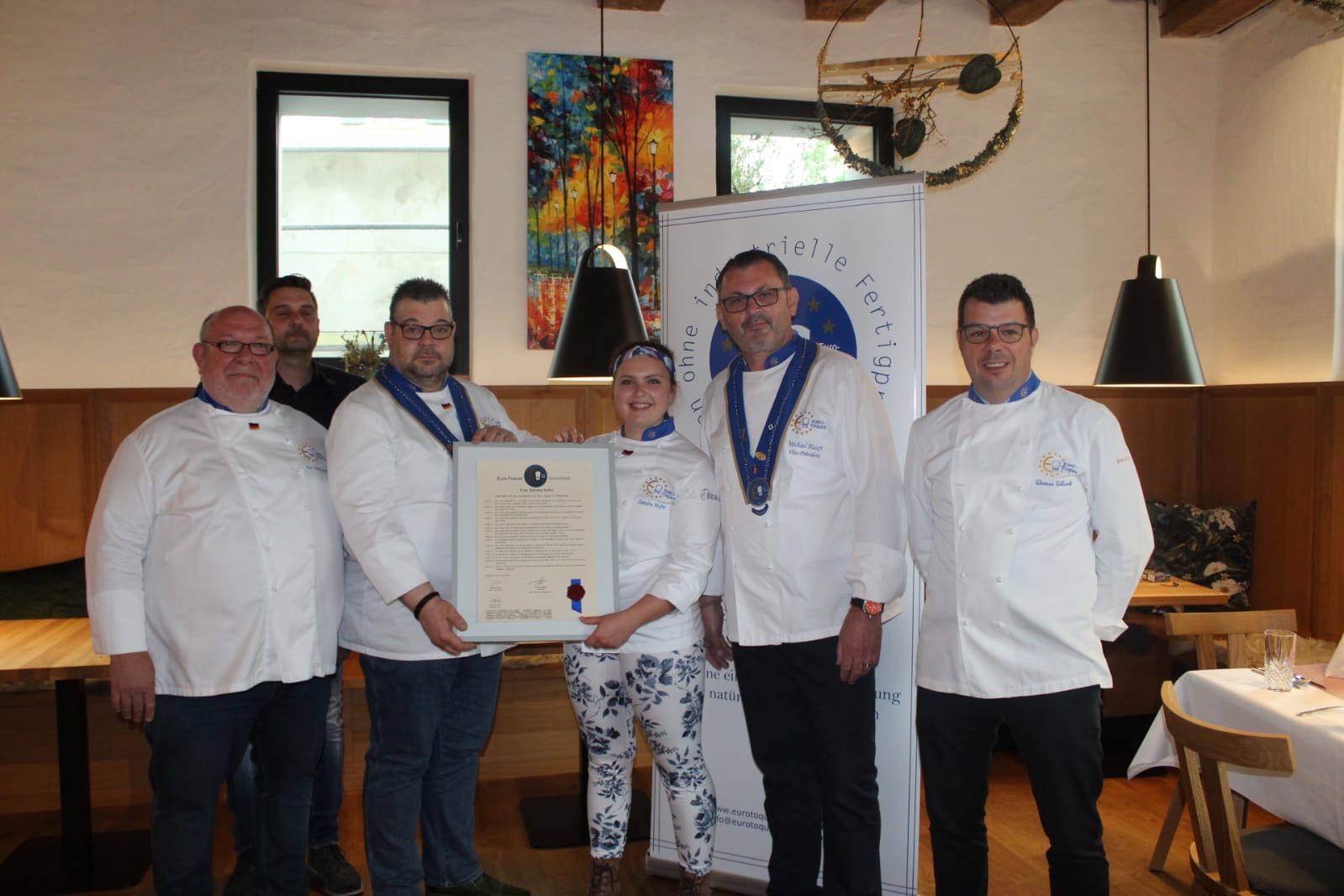 Unter der Patronnage von Manuela und unserem Euro-Toques Kollegen Marc Schumacher, darf sich Sandra Hofer frei entfalten und ihre regionale Genussküche weiter perfektionieren. Bei der Produktauswahl setzt Sandra Hofer bevorzugt auf heimische Erzeugnisse in Top Qualität, vornehmlich stammen sie aus Bayern. Rinder und Käse von der Allgäuer Alm von Markus Ziegler. Sven Maurer aus dem nahen Horgau liefert Saibling, Forellen, Stör und Waller. Grade zwei Bespiele für ein nachhaltig regionales Netzwerk der Genusspartnerschaft auf hochklassigem Niveau. Auf die Frage nach möglichen kulinarischen Vorbildern, antworte die fröhliche Küchenchefin aus Landshut ohne zu überlegen: „Ja, ich bin ja ich.“ Wunderbar! Ein wenig „verspielt, blumig, feminin aber immer authentisch“ sei ihre Frischeküche. Davon konnten sich die Überbringer der Ernennungsurkunde, die Vizepräsidenten Michael Haupt und Andreas Schreiner sowie unser Jugendbeauftragter Kurt Henkensmeier ein Bild machen und überzeugen.